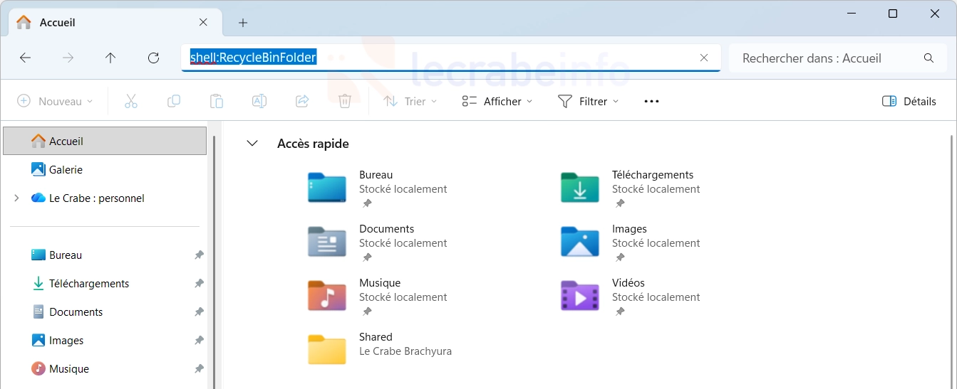 2. Dans la barre d’adresse, entrez : shell:RecycleBinFolder.