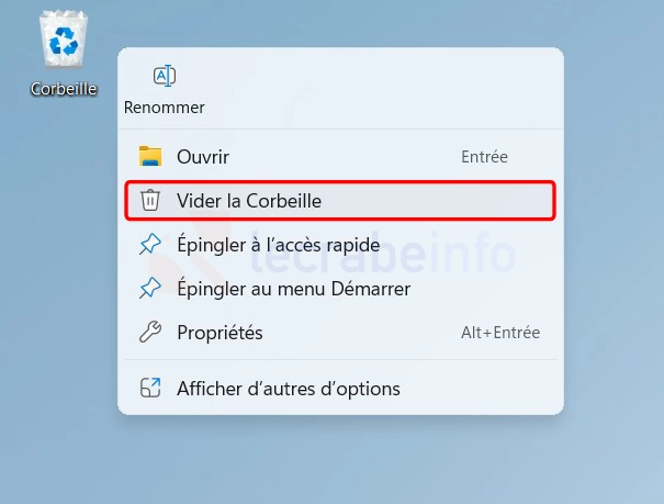 C’est la méthode la plus simple et la plus rapide. Lorsque la Corbeille est visible sur le Bureau, un clic suffit pour supprimer tous les fichiers qu’elle contient. Idéal pour un nettoyage immédiat sans avoir besoin d’ouvrir des outils de nettoyage :