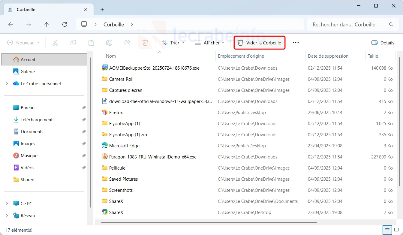 Dans l’interface du système, en revanche, Windows affiche une Corbeille unifiée. Elle regroupe tous les éléments supprimés provenant de tous les disques qui prennent en charge la Corbeille, et pas seulement ceux du lecteur C:. Lorsque vous videz la Corbeille, Windows supprime donc les fichiers supprimés sur l’ensemble des disques internes et externes compatibles.
