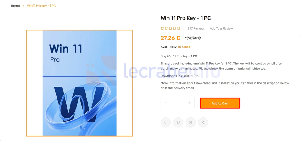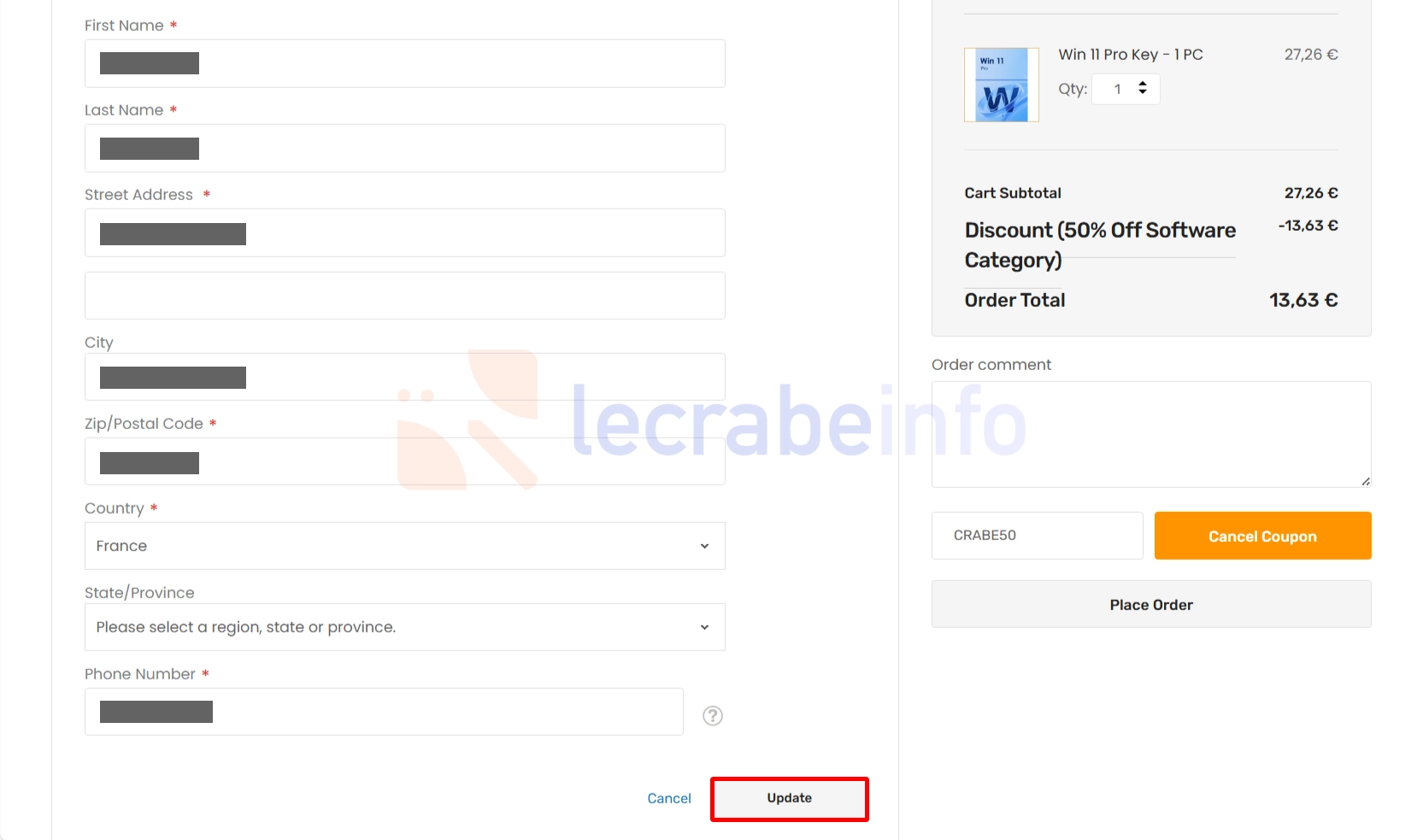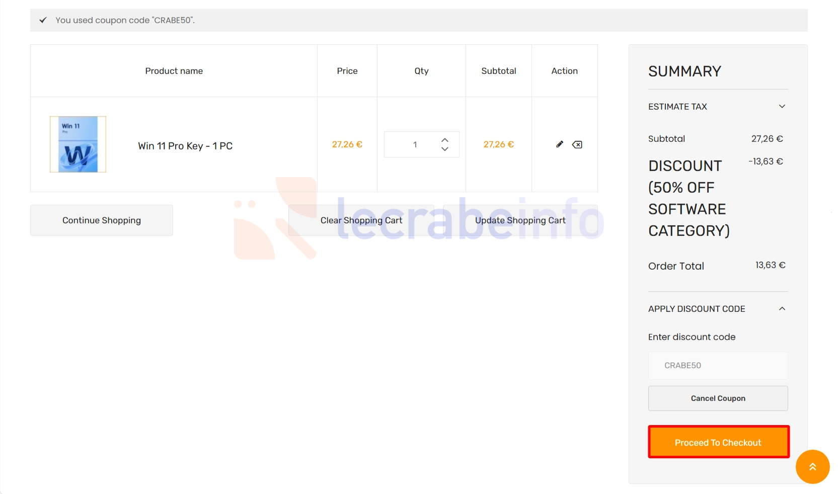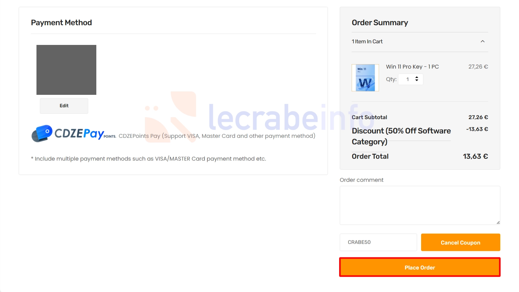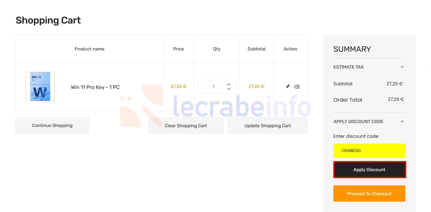 Dans votre panier, cliquez sur Apply Discount Code dans la colonne de droite. Saisissez le code CRABE50, puis cliquez sur Apply Discount pour obtenir 50% de réduction. La clé de produit Wndows 11 Professionnel vous revient alors à environ 13 €.