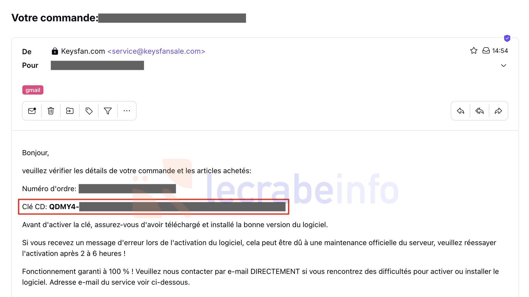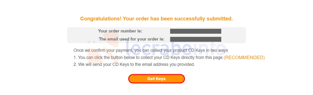 Une fois la commande passée, vous arrivez sur la page de confirmation de commande. D’ici quelques instants, vous allez recevoir votre clé de produit dans votre boîte de réception. Pour l’obtenir tout de suite, cliquez sur Get Keys (si la demande n’aboutit pas, patientez un peu puis cliquez de nouveau sur le bouton).
