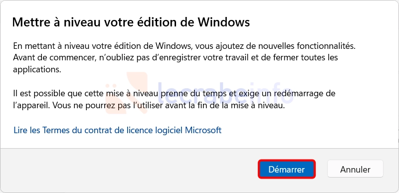 Cliquez sur Démarrer pour lancer la mise à niveau vers l’édition Professionnel de Windows 11.