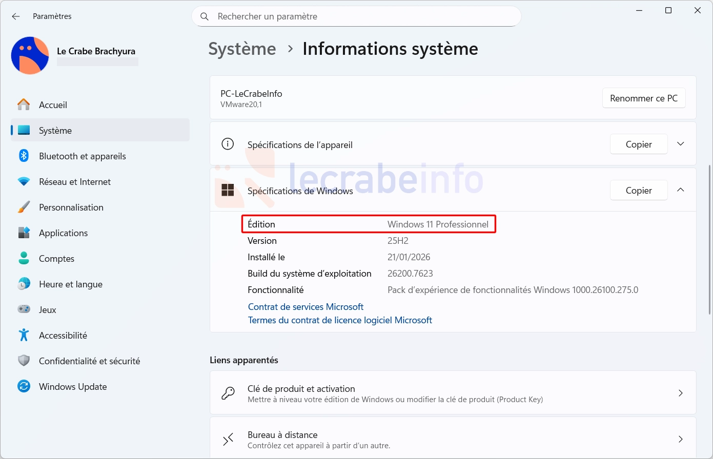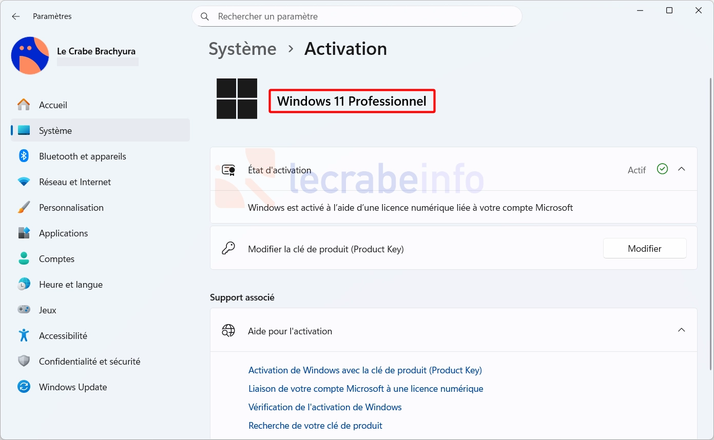 Vérifiez que la mise à niveau vers Windows 11 Professionnel s’est bien déroulée en vous rendant dans les Paramètres -> Système -> Activation. Vous devriez voir « Windows 11 Professionnel » en haut de la page.