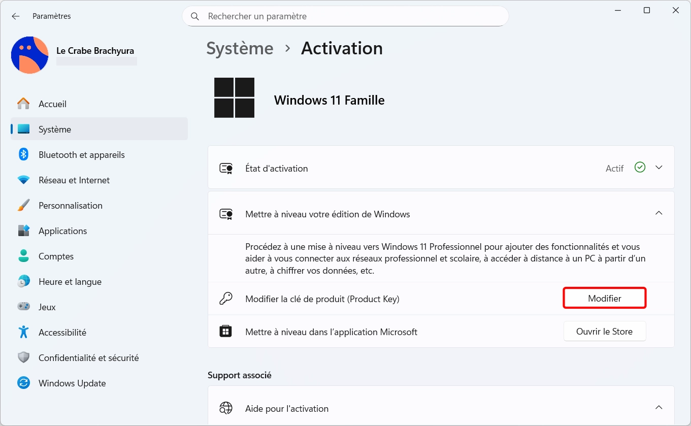 À côté de Modifier la clé de produit (Product Key), cliquez sur Modifier.