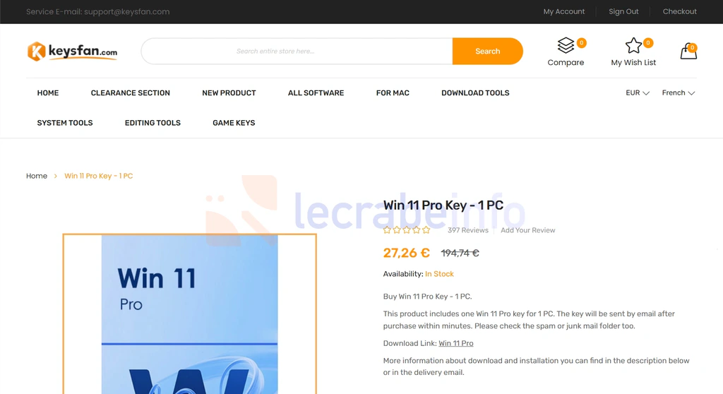Avant de pouvoir passer à Windows 11 Professionnel, vous devez disposer d’une clé de produit valide. Si vous n’en avez pas déjà une, il est possible d’en acheter une en ligne auprès de revendeurs spécialisés. Je vous recommande de passer par Keysfan, un revendeur proposant des licences authentiques pour Windows 11. J’ai d’ailleurs un partenariat avec eux, ce qui me permet de vous faire bénéficier d’un code promo offrant 50 % de réduction.