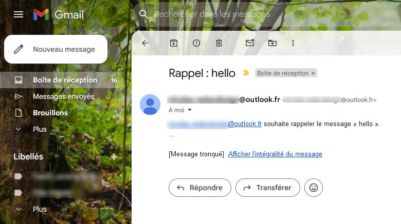 J’ai utilisé « Rappeler ce message » depuis Outlook 365 via un compte de messagerie Outlook pour un envoi vers une adresse Gmail. Après visite de la boîte de réception Gmail, on constate l’arrivée du mail d’origine (qui reste là malgré le rappel), puis du message énonçant le rappel du courrier.