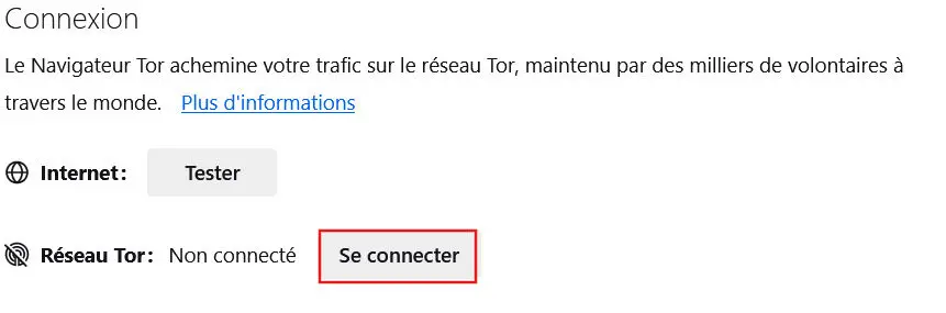 - La partie Connexion permet, à la fois de tester votre connexion Internet et de vous connecter au réseau Tor. Afin de tester le bon fonctionnement du réseau Internet auquel vous êtes relié, cliquez simplement sur le bouton Tester.