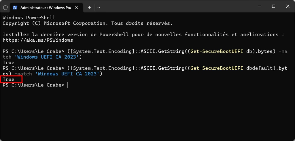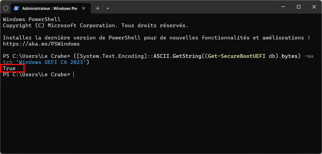 • Si la commande renvoie True : les nouveaux certificats 2023 sont intégrés dans le firmware UEFI de votre ordinateur. C’est généralement le cas si vous avez un PC récent (fabriqué en 2024 ou 2025) ou si vous avez installé une mise à jour du firmware proposée par votre fabricant. C’est parfait ! ✅