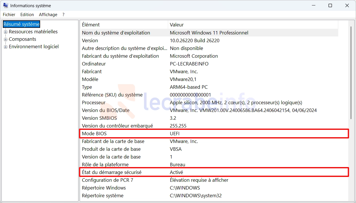 3. Dans la fenêtre Informations système, recherchez la ligne « État du démarrage sécurisé » et vérifiez qu’elle indique « Activé ».