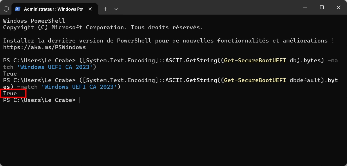 • Si la commande renvoie True : les nouveaux certificats 2023 sont intégrés dans le firmware UEFI de votre ordinateur. C’est généralement le cas si vous avez un PC récent (fabriqué en 2024 ou 2025) ou si vous avez installé une mise à jour du firmware proposée par votre fabricant. C’est parfait ! ✅