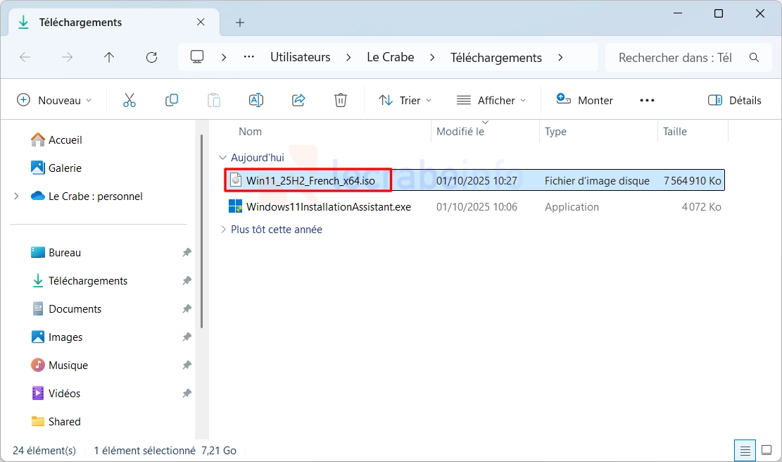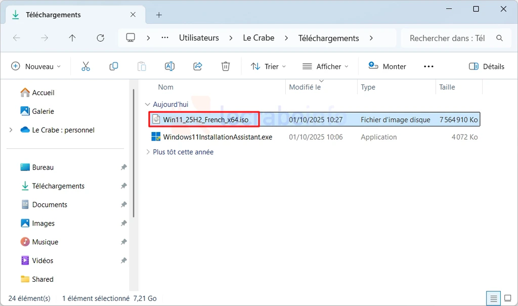 7. Une fois le téléchargement terminé, vous trouverez l’image ISO de Windows 11 25H2 dans le dossier Téléchargements de votre compte utilisateur.