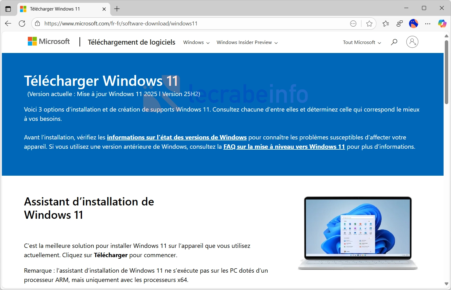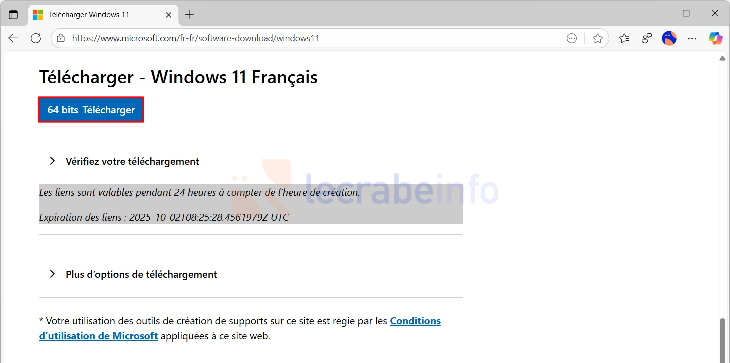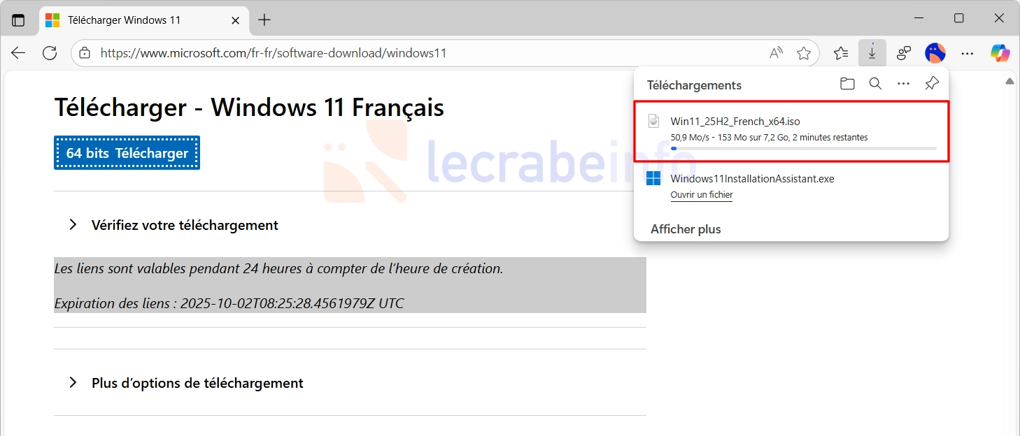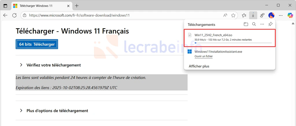 Pour vous aider à contourner ce blocage, j’ai téléchargé et placé les fichiers ISO officiels de Windows 11 25H2 directement sur les serveurs de lecrabeinfo.net. Vous pouvez les télécharger en un clic et en toute confiance (ce sont les images officielles publiées par Microsoft) depuis les pages suivantes :