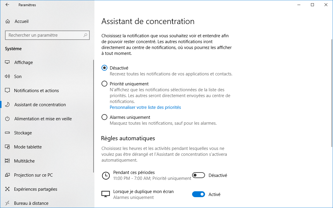 • Assistant de concentration : il est possible de personnaliser les applications qui peuvent envoyer des notifications lorsque l’Assistant de concentration est activé, et d’activer automatiquement l’Assistant de concentration durant certaines heures.