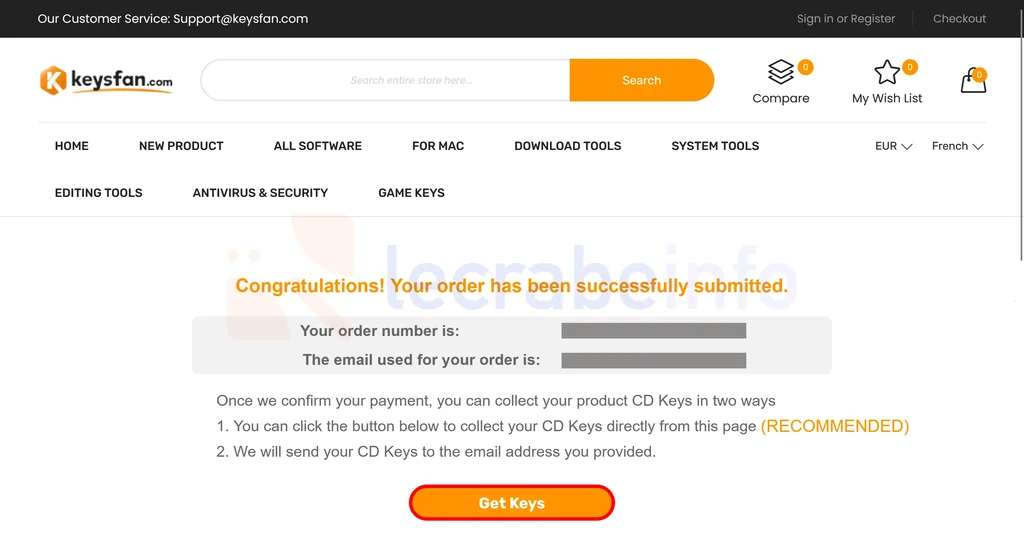 Une fois la commande passée, vous arrivez sur la page de confirmation de commande. D’ici quelques instants, vous allez recevoir votre clé de produit dans votre boîte de réception. Pour l’obtenir tout de suite, cliquez sur Get Keys (si la demande n’aboutit pas, patientez un peu puis cliquez de nouveau sur le bouton).