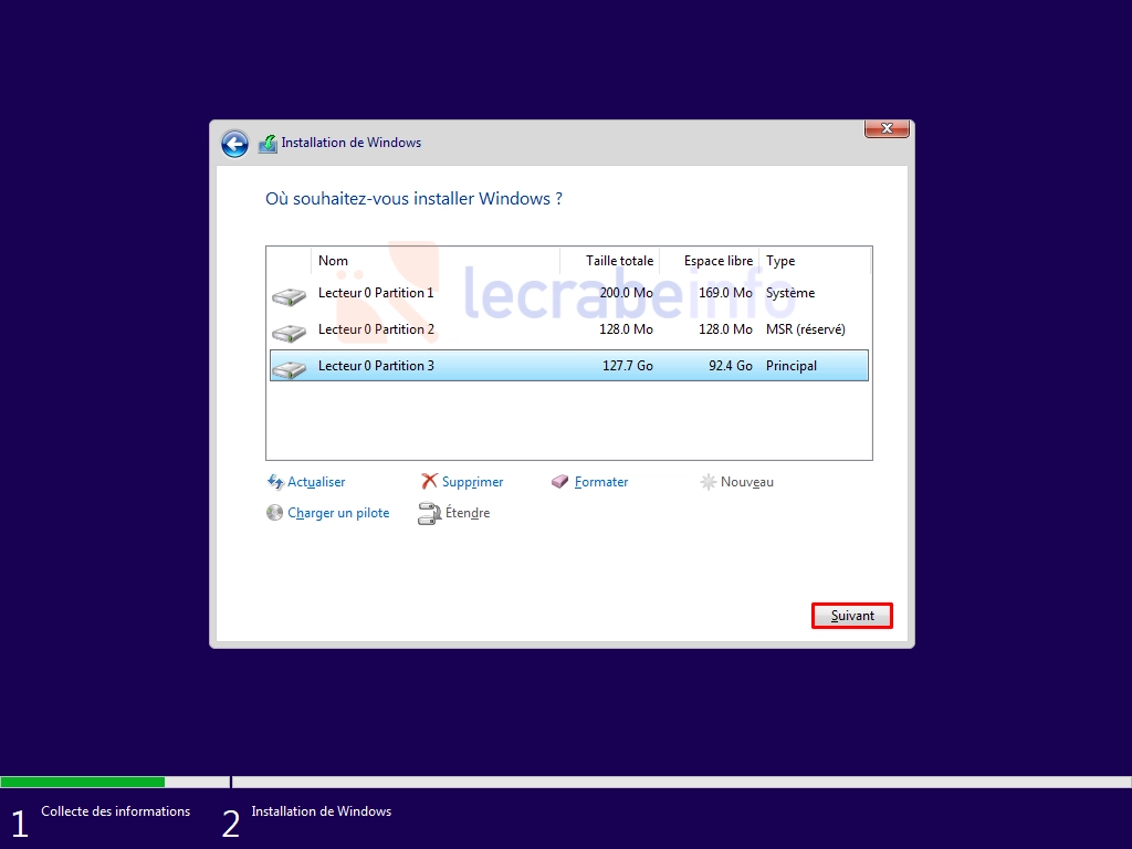 Si vous souhaitez réinitialiser votre ordinateur et repartir de zéro (attention, aucune récupération ne sera possible) : supprimer toutes les partitions de votre disque système, sélectionnez l’espace non alloué puis cliquez sur Suivant.