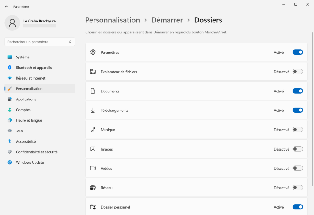 Heureusement, Microsoft a ajouté des options de personnalisation dans les Paramètres qui permettent d’ajouter des raccourcis dans le menu Démarrer de Windows 11 : il est ainsi possible d’activer des raccourcis vers les dossiers utilisateur (Documents, Musique, Images, Vidéos et Téléchargements) et également vers certains composants (Paramètres, Explorateur de fichiers, Réseau et Dossier personnel).