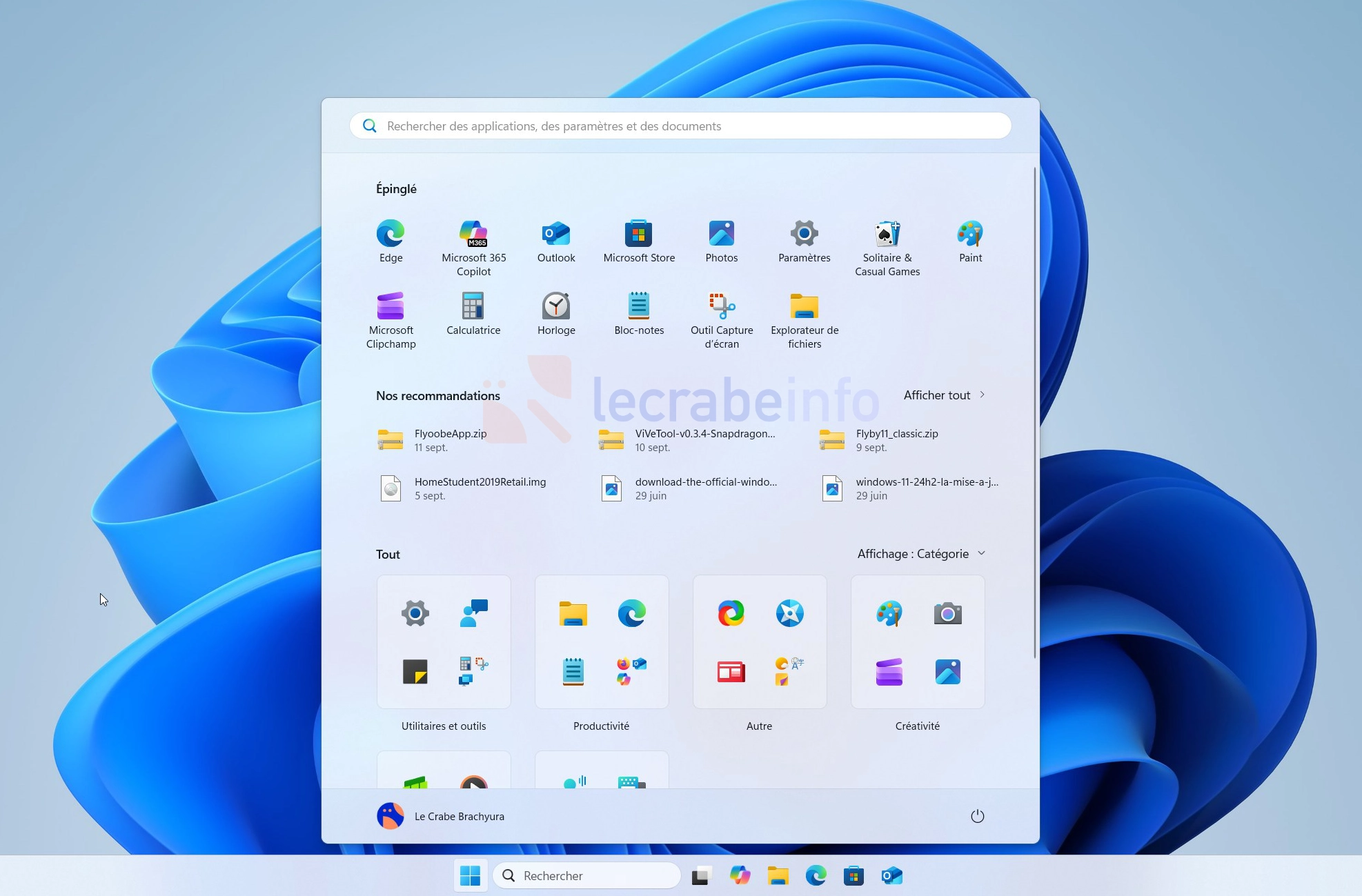 Une fois le redémarrage terminé, le nouveau menu Démarrer devrait apparaître avec ses vues en catégorie et en grille, ainsi qu’une interface plus claire et mieux adaptée à votre écran :