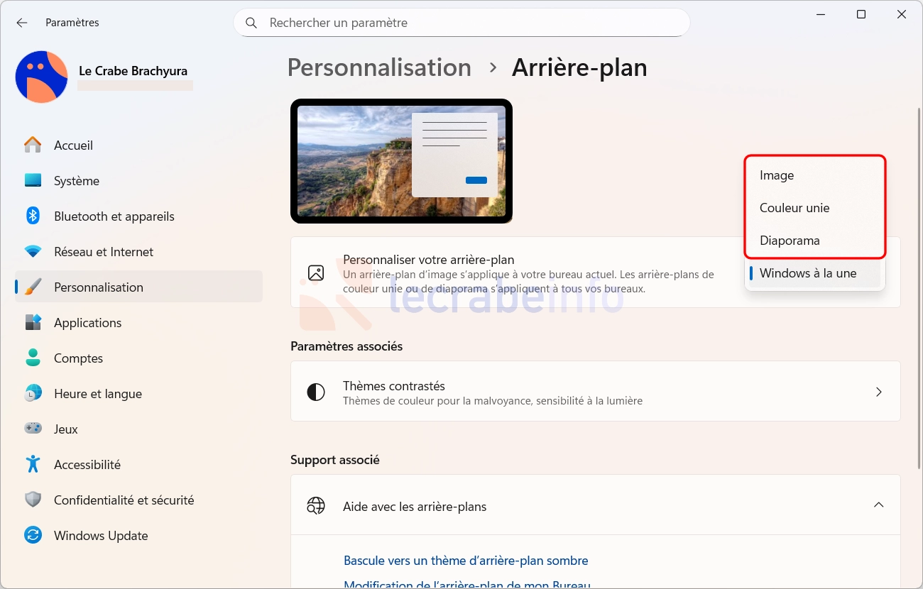 3. Dans Personnaliser votre arrière-plan, remplacez « Windows à la une » par Image, Couleur unie ou Diaporama.