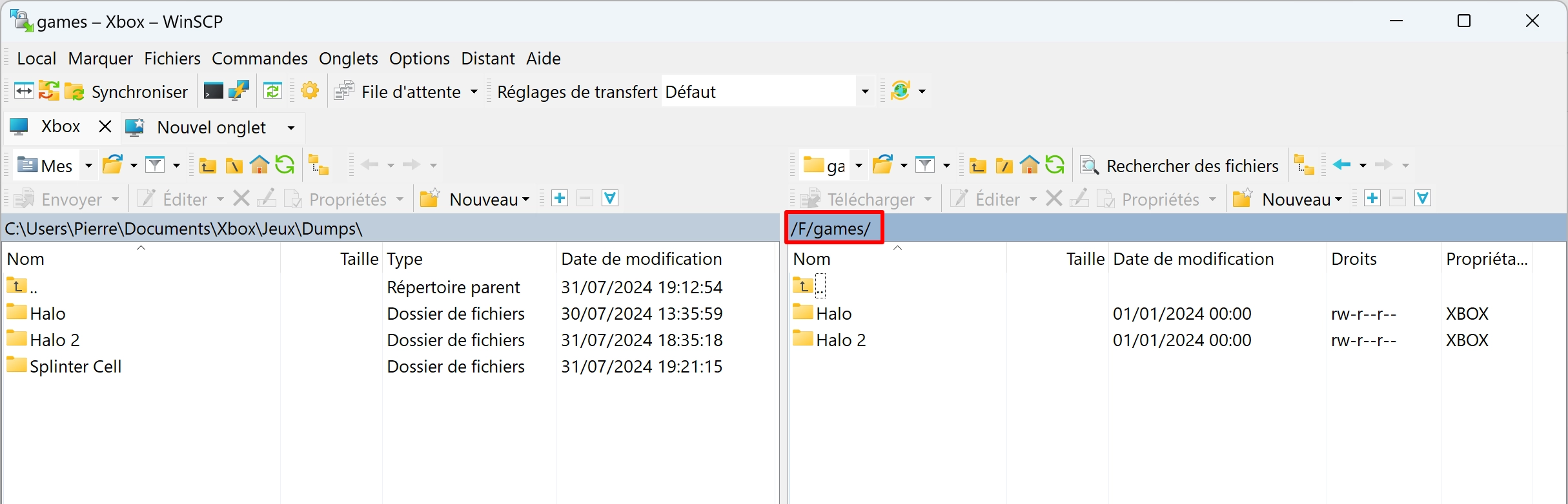 - Dans WinSCP, dans le volet de droite (votre Xbox), déplacez-vous vers le dossier F:\games (créez-le s’il n’existe pas). C’est ici que sont stockés vos jeux Xbox.